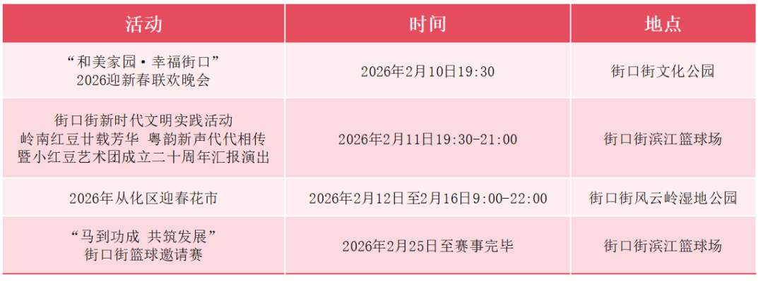 接下来,街口街将继续探索“内需主导、消费拉动、内生增长”的发展模式,持续扩内需、优供给。春节前后,街道还将陆续推出“和美家园·幸福街口”2026迎新春联欢晚会、岭南红豆廿载芳华粤韵新声代代相传——暨小红豆艺术团成立二十周年汇报演出、2026年从化区迎春花市、“马到功成共筑发展”街口街篮球邀请赛等多元活动,着力营造丰富活跃的文旅消费市场,诚邀广大市民游客持续参与,共创共享发展成果。
